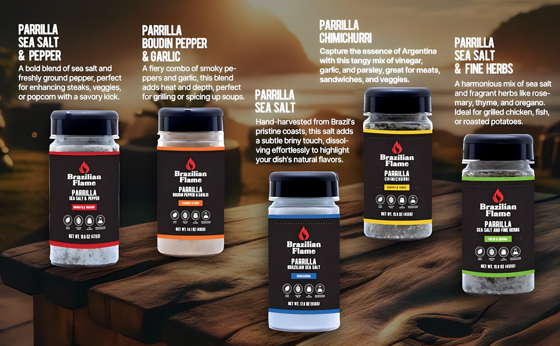 Introducing the sizzling flavors of Brazil! Experience the vibrant taste of our Parrilla Brazilian Flame Seasoning collection, featuring 5 distinct varieties of salt in a unique set. From the smoky Chimichurri to the zesty Boudin Pepper & Garlic, elevate your culinary creations with these irresistible blends. Spice up your dishes and ignite your taste buds today!