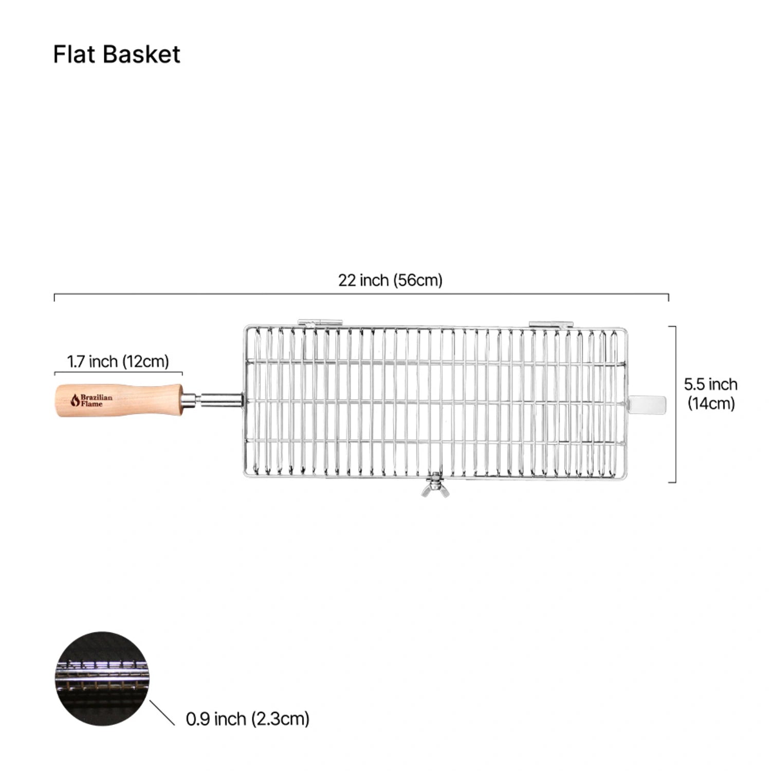 The flat basket is great for grilling burgers, hotdogs, shrimp, prawns, a delicate whole fish, cherry tomatoes, etc., in your Brazilian Flame Rotisserie Grill.