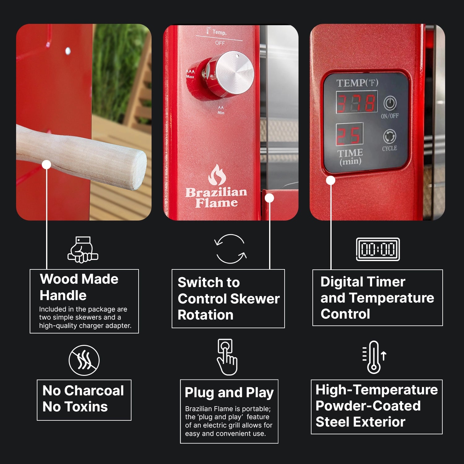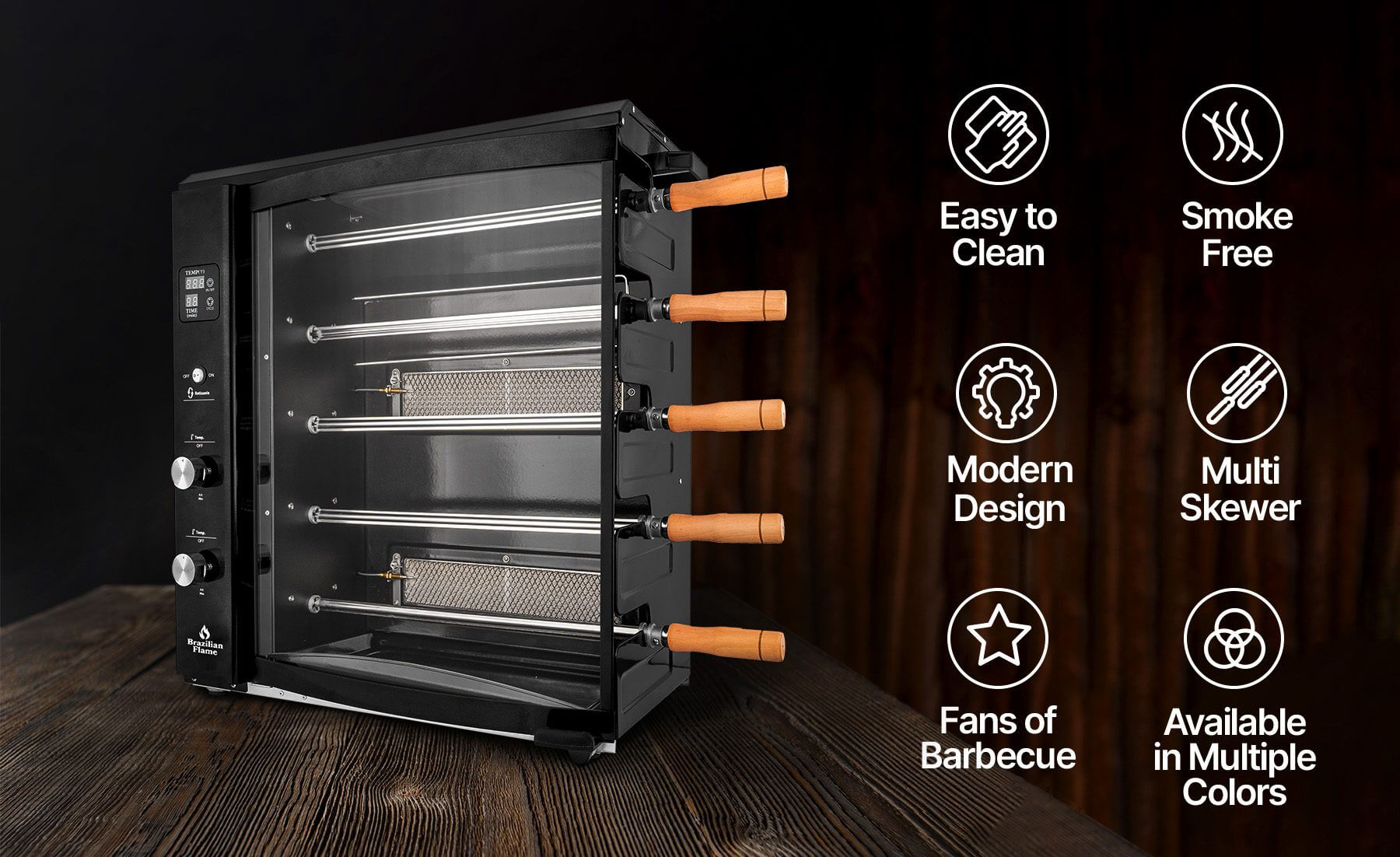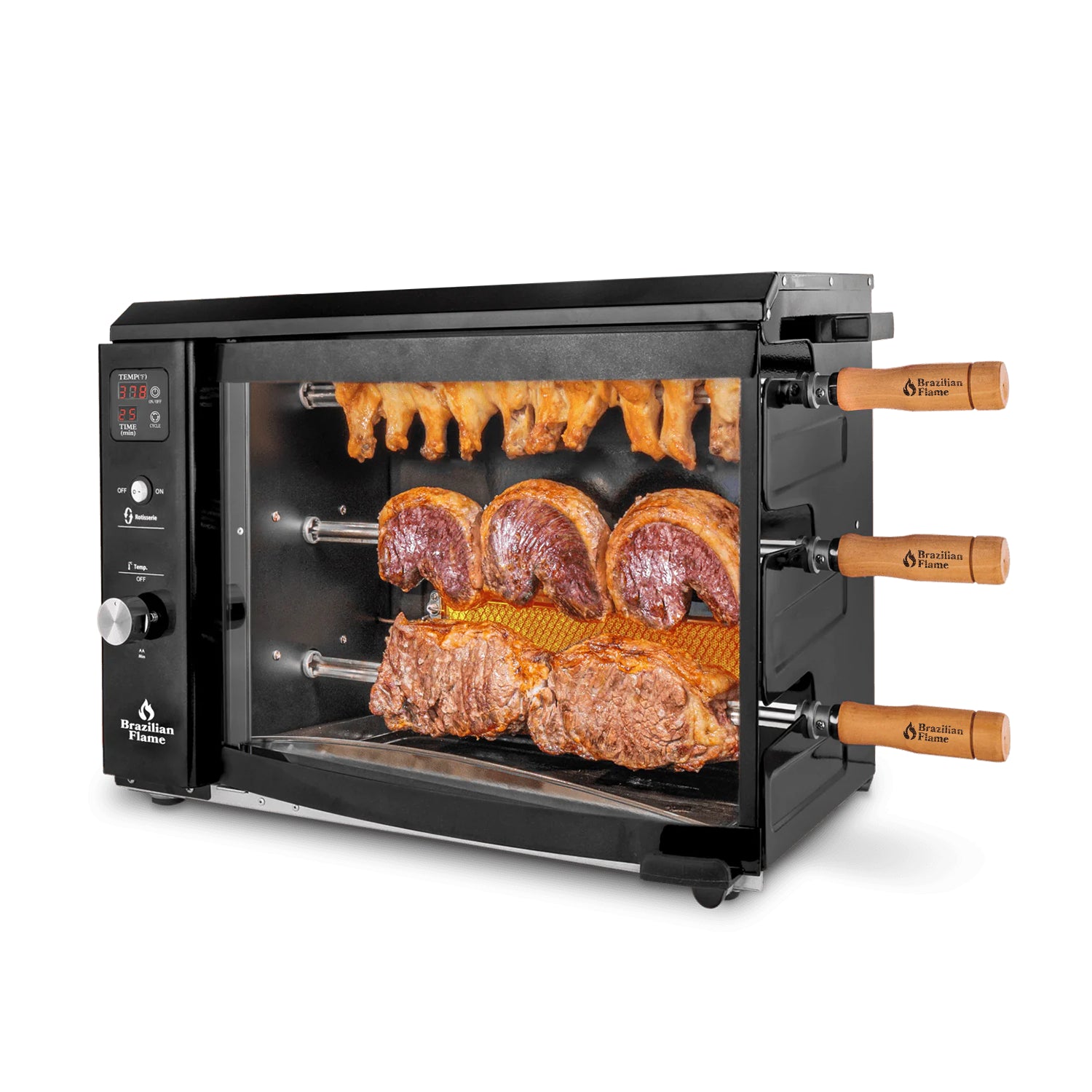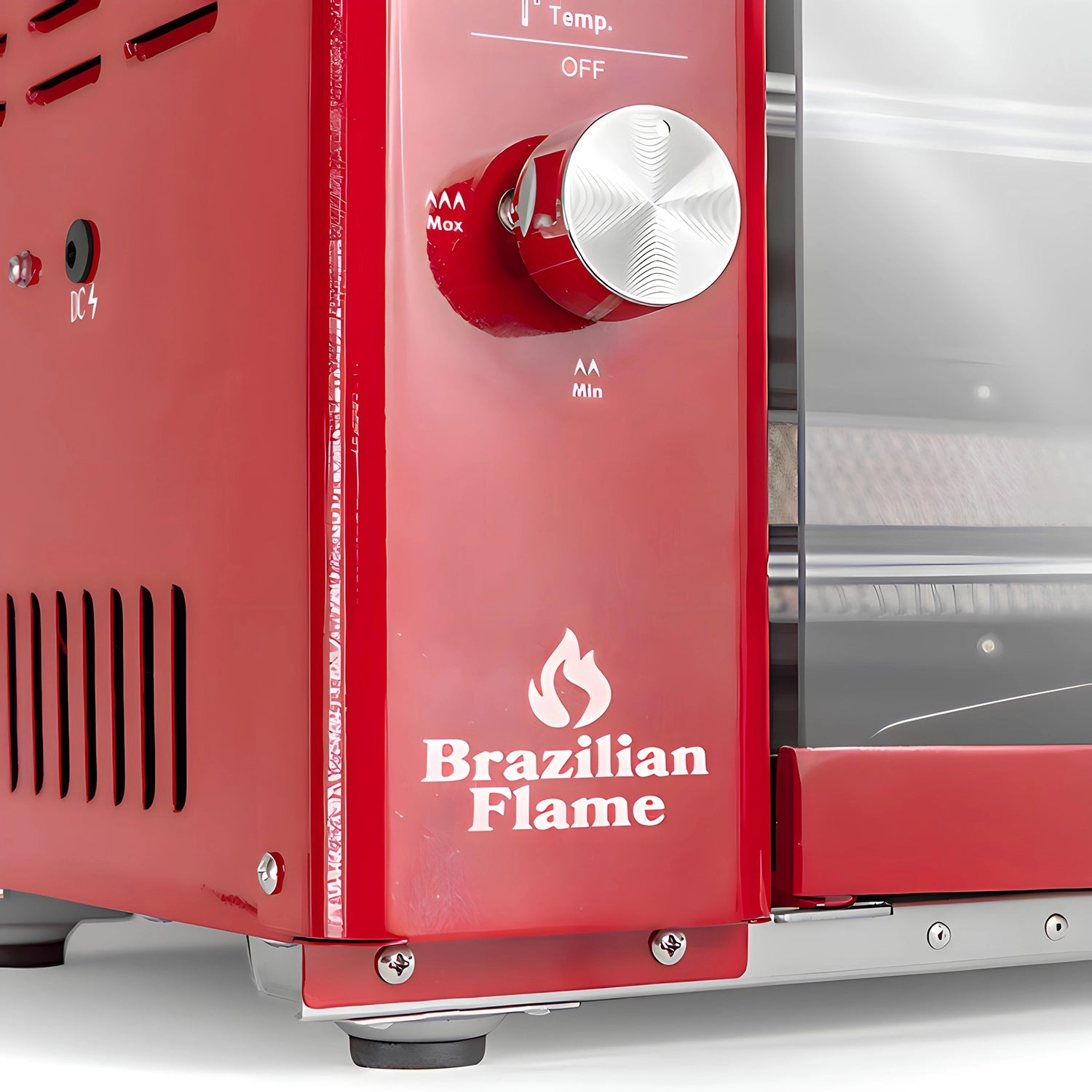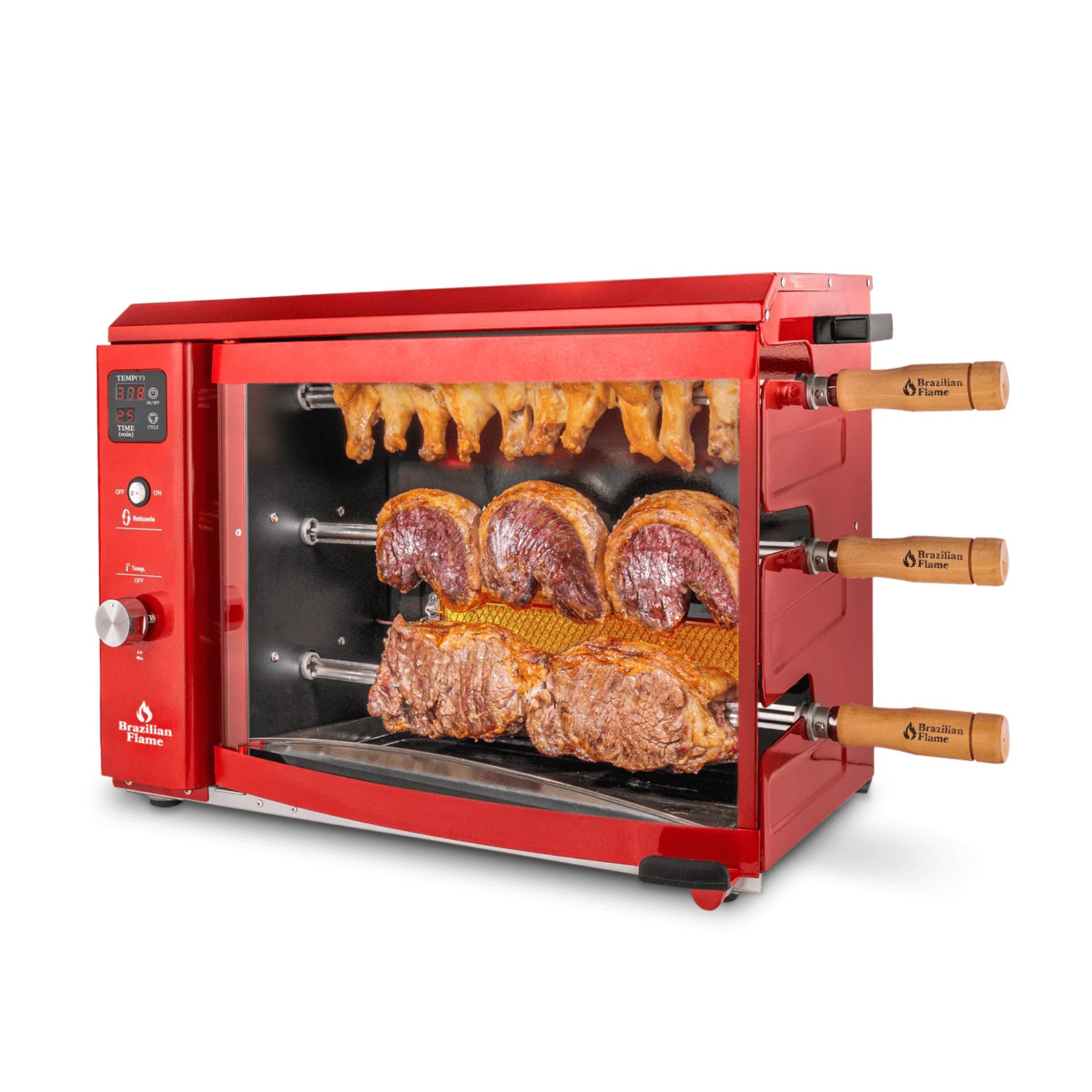O Brazilian Flame convida você a experimentar o autêntico sabor da grelha brasileira no conforto da sua casa. A grelha permite cozinhar carnes, peixes, vegetais e muito mais em um churrasco centenário ao estilo brasileiro. Um sistema giratório de vários espetos garante que frango, peixe, bife e vegetais sejam cozidos uniformemente e muito mais saborosos do que o forno, a frigideira ou a grelha padrão. O design moderno e a conveniente bandeja de coleta de gordura tornam esta churrasqueira rápida e fácil de limpar, enquanto a tecnologia de ponta permite o verdadeiro sabor do churrasco sem fumaça! Queimadores ou elementos de aquecimento eletrônicos controlados individualmente na parte traseira e uma porta curva de vidro transparente oferecem melhor visualização e melhor controle de torra. Fãs de churrasco, bifes grelhados, comida brasileira e entusiastas de atividades ao ar livre, esta é sua chance de colocar as mãos no primeiro desse tipo na América.