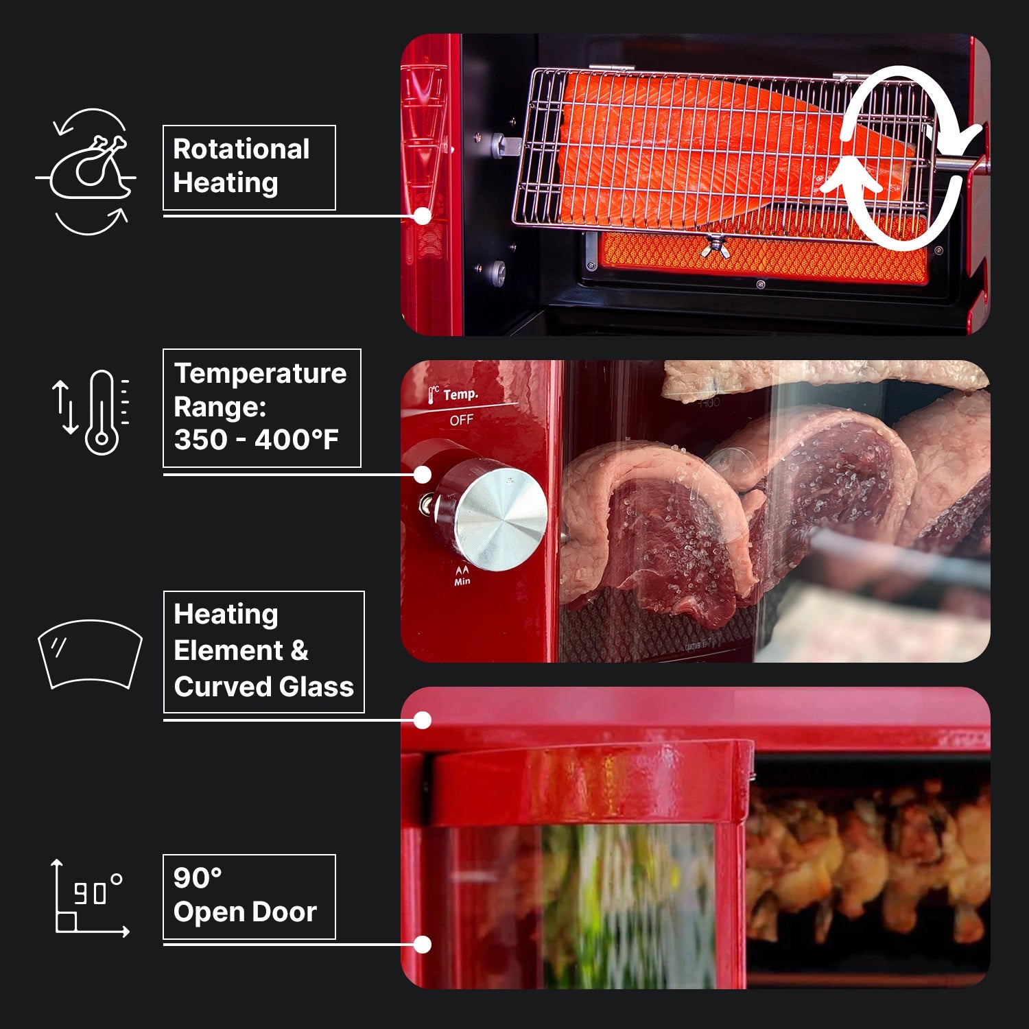 - EASY-TO-CLEAN & SMOKE-FREE: This rotisserie grill is quick and easy to clean because it has a modern design and a tray for collecting grease. It also has cutting-edge technology that lets you get real BBQ flavor without smoke.
